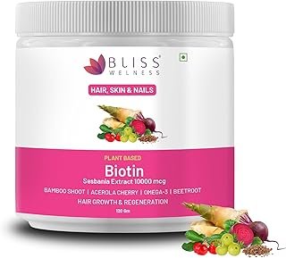 Bliss Welness Biotin Powder | Sesbania Pomegranate Tamarind Bamboo Shoot Amla Beetroot Acerola Cherry Omega 3 Extracts | Hair Follicle Growth Skin Nutrition Hair Fall Control Vegetarian Health Supplement – 120 gms