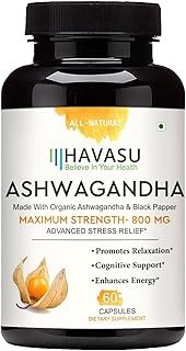HAVASU Organic Ashwagandha Root with Black Pepper 60 Capsules 800mg, Natural Stress & Mood Relief, Sleep Aid & Thyroid Support Supplement; Ayurvedic Nootropic for Focus & Energy, Pack 1