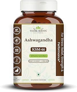 Ashwagandha KSM-66 Capsules (450 mg) | 100% Pure Root Extract | Extra Strength Natural Formulation | Help Mental Clarity and Focus| Support to Reduces Stress and Anxiety – 60 Vegetarian Capsules (Pack of 1, 60 Caps)