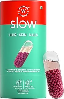 Wellbeing Nutrition Slow Skin Hair and Nails Capsules for Women & Men 10,000mcg Biotin, Keratin, Vit C, Glutathione, HLA, Primrose Oil | Glowing Skin, Strong Hair & Nails, DHT blocker, 60 Capsules